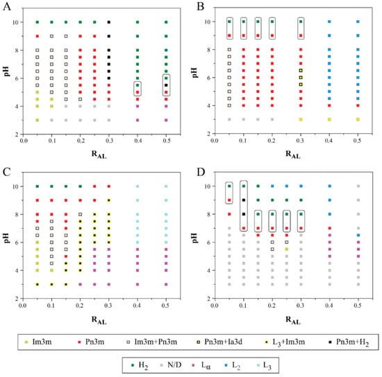 The formation of various mesophase structures can be rationalised through the concept of the critical packing parameter (CPP); CPP = V/al, where V is the effective volume of the amphiphile’s hydrophobic tail, a is the headgroup’s effective area, and l is the effective length of the hydrophobic chain. Lamellar phases (Lα) are typically observed with a zero interfacial curvature (CPP = 1). For CPP values greater than 1, inverse phases, such as Q2 and H2, are formed with increasing interfacial curvature. Q2 phases consist of a single continuous curved lipid bilayer creating an ordered three-dimensional complex cubic network, separating two nonintersecting but continuous water channels []. The three main types of cubic structures observed in amphiphile–water systems are gyroid (G), diamond (D), and primitive (P) surfaces, which correspond to space groups Ia3d (G), Pn3m (D), and Im3m (P), respectively. An H2 phase displays an ordered two-dimensional structure with water channels surrounded by a lipidic bilayer (reversed cylindrical micelles), which are packed on a hexagonal array [,]. An increase in factors such as temperature, hydrophobic chain unsaturation, tail length, and tail branching generally results in higher CPP. Figure 3 displays partial phase diagrams with pH and RAL varied for all LNPs at RT. The change in the mesophase structure of LNPs due to the addition of aminolipids at neutral pH (concentration effect) and changing pH (pH effect) is discussed in detail below.