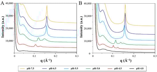 Representative one-dimensional SAXS profiles for nanoparticles prepared by doping OAPy-4 to MO at RAL = 0.4 at 37 °C (A) and at room temperature (B).