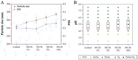 (A) Particle size and size distribution (PDI) of SN-38-loaded MO + OAPy-4 LNP. The control sample was LNPs without SN-38. The LNPs were prepared by adding 1, 2, 5, and 10 wt.% of SN-38 to the total quantity of lipid mixture consisting of MO and OAPy-4, which were stabilised by Pluronic F-127. The experiments were performed in triplicate, and the results were reported as the mean ± standard deviation. (B) A partial phase diagram for SN-38-loaded LNPs with respect to pH at 37 °C. The boxes represent the phase transition from H2 to Q2 with the decrease in pH.