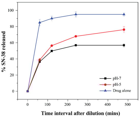 The in vitro release of SN-38 from the nanoparticles was evaluated using a dynamic dialysis method []. After removing unencapsulated drug, 1 mL of SN-38-loaded nanoparticles was placed inside a dialysis tube (Pur-A-Lyzer™ Maxi Dialysis tube molecular weight cut-off 10 kDa) and immersed in 1000 mL of phosphate buffer maintained at 37 ± 1.0 °C and stirred at 400 rpm. Release experiments were performed in triplicate and on three independently prepared SN-38 encapsulated LNPs. For physiological pH, experiments were carried out by dialysing the formulations against 1000 mL of phosphate buffer (pH 7.0). Lower pH experiments were conducted by dialysing the formulations against 1000 mL of phosphate buffer adjusted to the required pH. The HPLC method quantitatively measured the SN-38 that remained in the dialysis tube. At predetermined time intervals (60 min, 120 min, 240 min, and 420 min), 10 µL of the sample was withdrawn from the dialysis tube and diluted with 990 µL of the HPLC solvent []. The method of determining the release kinetics by drawing the sample from inside the dialysis bag was discussed in detail in recent papers [,,,].
