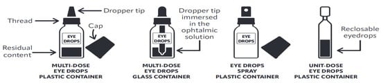 The eye is a complex organ with specialized anatomy and physiology [,,,] and a robust local immune response [,]. A wide range of pathologies can affect the eyes due to local triggers or systemic diseases []. Therapeutic and diagnostic eye drops offer a noninvasive route of ocular drug delivery []. Eye drops are sterile topical ophthalmic formulations containing a solution, emulsion, or suspension of one or more active ingredients []. These conventional dosage forms account for 90% of marketed ophthalmic solutions [,]. Eye drops are generally ready-to-use marketed products with or without preservative agents [] or, to a lesser extent, prepared in hospitals to meet specific patients’ needs [,,]. Eye drops are available in unit-dose and multiple-dose containers (Figure 1).