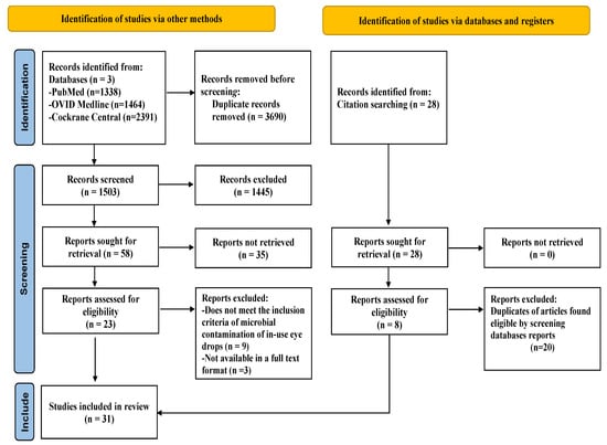 - The search strategy principle was based on dividing the topic into two concepts: (1) eye drops and (2) microbial contamination. Ovid MEDLINE was first searched to identify all the possible MeSH terms with their corresponding keyword equivalences to increase the sensitivity of the search strategy. The search strategy combined the two concepts as follows: exp Ophthalmic Solutions/OR ((ophthalm* or ocular or eye?) adj2 (MEDICATION? or drop? or solution? or preparation?)).tw. OR (((eye or ophthalm* or ocular) adj2 drop?) or eyedrop?).tw. AND exp Eye Infections/AND Drug Contamination/AND (contamination? or cross-contamination?).tw. [mp = title, abstract, original title, name of substance word, subject heading word, floating subheading word, keyword heading word, organism supplementary concept word, protocol supplementary concept word, rare disease supplementary concept word, unique identifier, synonyms]. All searches were limited to humans and the English language, with restrictions on publication dates starting from 1 January 1992 to 1 June 2022.