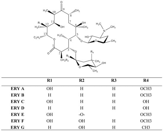 Erythromycin (ERY) is a therapeutical compound belonging to the class of macrolide antibiotics, originally discovered by McGuire et al. in 1952 [1] and later produced through biosynthesis during fermentation from species of the Gram-positive Saccharopolyspora erythraea, formerly classified as Streptomyces erythraeus [2,3]. The erythromycin group generated by bacterial strains encompasses numerous structural variations, that is, ERY A, B, C, D, E, F and G (Figure 1).