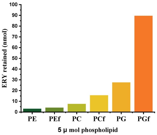 Liposomal ERY was first reported in 1991, within an exhaustive study which focused on the influence of the phospholipid type over the encapsulation efficiency (EE). Using the film dehydration/rehydration vesicle (DRV) method for preparation (consisting in the rehydration of the lipid/ERY film in phosphate-buffered saline (PBS) and sepharose CL-4B column chromatography for purification), the authors obtained liposomes with diameters between 250–350 nm [33]. They established that phosphatidylglycerol (PG) has a superior ability to retain ERY compared to phosphatidylcholine (PC) or phosphatidylethanolamine (PE). This was attributed to the least bulky head group of PG, therefore creating smaller steric barriers for ERY diffusion into the hydrophobic layers. When the phospholipid was composed of mixed fatty acids (saturated and unsaturated ones), the ability to retain ERY significantly increased. This was justified by the capacity of unsaturated fatty acids to improve the fluidity of the hydrophobic part of the phospholipid, making it more favourable for encapsulation of hydrophobic ERY (Figure 3). It was also discovered that the number of hydroxyl groups in the polar head of the phospholipid did not play a critical role in ERY encapsulation.