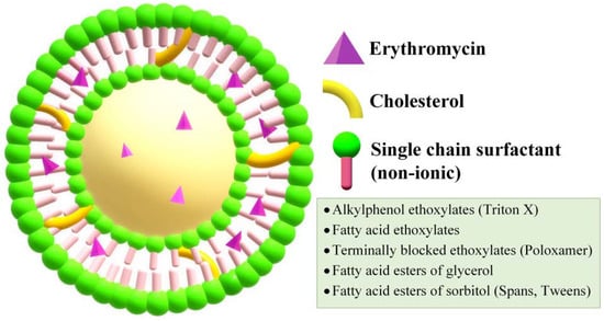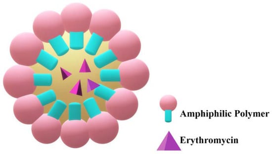 Micelles are obtained by similar preparation methods and composition as niosomes, with the difference that cholesterol is absent (Figure 7). Liu et al. developed a micelle formulation encapsulating ERY with the use of Pluronic F-127 nonionic surfactant [62]. The obtained micelles had an EE of 28.3%, and they displayed a spherical morphology with an approximate diameter of 193 nm. In vitro release studies concluded that over 90% of the drug was released over 8 h, but the antibacterial activity tested on strains of S. aureus and Escherichia coli (E. coli) revealed MIC values five times higher than those of simple ERY.