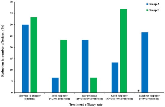 Treatment efficacy based on the reduction in number of lesions. * The Excellent response percentage in group B was reported to be 0%. (Group A: Niosomal ERY, Group B: combination of ERY and zinc acetate).