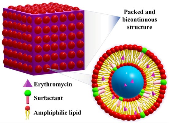 Cubosomes form a viscous optically clear material, suitable for cosmetic applications, and generally for transdermal drug delivery. In this context, the entrapment of ERY into cubosomes was regarded as an innovative alternative to the other lipid-based formulations aiming to minimize side effects while preserving its efficacy in acne treatment. Cubosomal ERY was prepared employing the emulsification method, by adding hot water, under stirring, to a mixture of glyceryl monooleate, poloxamer surfactant and ERY [67]. The optimization of glyceryl monooleate and poloxamer concentrations, stirring speed and time led to ERY-loaded cubosomes with EE values of 95% and an average particle size of 264 nm. The particles were observed to have a spherical shape along with a smooth surface and forming a gel with pseudoplastic behaviour. ERY cumulative release was 75% in the first 7 h and reached 88% after 24 h (pH = 6.4).