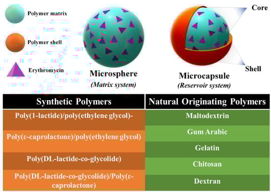 Due to the lipophilic nature of ERY, the most suitable method for its encapsulation involves emulsion solvent evaporation performed in an aqueous environment [80]. There have been many attempts to achieve ERY microcapsules targeted for specific applications, mostly by using various polymers as coating matrixes. Some of the most relevant are described below, as follows.