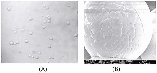 SEM images of ERY gelatine microspheres: (A) (100×), (B) (20,000×). Reprinted with permission from [19].