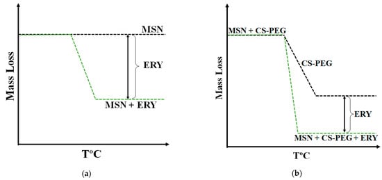 Designing ERY microparticles for in vivo applications, biodegradable poly(1-lactide) (PLA)/poly(ethylene glycol) (PEG) copolymer, containing 5% and 10% PEG, respectively, was proposed as a matrix constituent [84]. The choice was justified by the high solubility of PEG, which has the ability to improve the hydrophilicity of PLA and thus the diffusivity of water and drug molecules through the polymer carrier [85]. The morphological determinations showed that the PLA/PEG microcapsules had a larger size compared to PLA ones (57 µm vs. 40 µm) and a rougher surface, attributed to the higher swelling ability induced by PEG. However, the presence of PEG improved the loading efficiency, from an initial 42% in the case of PLA to 48 and 56% for PLA/PEG containing 5% and 10% PEG, respectively. Furthermore, the inclusion of PEG improved the biodegradation rate, reaching a mass loss of ~60% in three weeks, for the PLA/PEG microparticles containing 10% PEG, compared to the PLA homopolymer which showed a much smaller rate of ~30% in a similar period. This alteration affected the drug release rate, reaching 2.7 ppm for PLA/PEG 10% microparticles versus 1.4 ppm for the PLA ones, after 30 h.