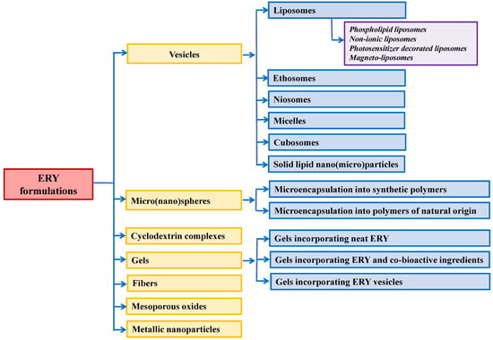 The literature reveals a large variety of vesicular systems used to deliver drugs, such as lipid particles, liposomes, niosomes, sphingosomes, pharmacosomes, transferosomes, polymeric micelles, etc. [24]. Generally speaking, vesicular carriers are formulated with lipid materials for the purpose of overcoming challenges of drug delivery and improving therapeutic outcomes. Encapsulation of both hydrophilic and lipophilic drugs, enhancement of bioavailability, increasing the drug’s circulation time, resolving toxicity issues and lowering therapeutic dosages are some of the major benefits of lipid-based drug delivery. In the following, ERY vesicle formulations developed over a long time; their preparation and performances will be presented.