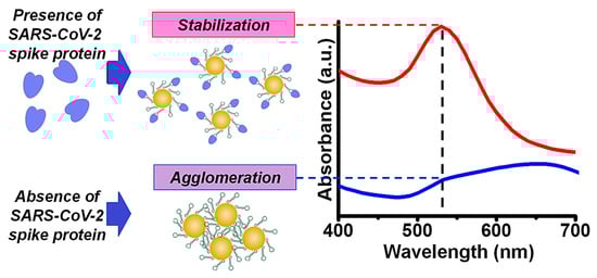 The visualization of Au nanomaterials can simply be performed by photometry and electron microscopy due to the high electron density, specific absorption, and scattering in the visible and near-infrared region [38]. These nanomaterials have been explored for (bio)imaging, (bio)sensing, and cellular labelling, providing excellent opportunities for the specific detection of various diseases (Table 2) [38,39]. The capping agents in biosensing can provide some benefits such as specific recognition, improved biocompatibility and biodegradability, electrostatic interactions, enhanced stability, and water solubility. For the detection of viral infections, Lew et al. [40] reported the construction of a novel nanosystem based on epitope-functionalized Au nanomaterials for the specific recognition of SARS-CoV-2 IgG antibodies, providing opportunities for detecting the SARS-CoV-2 infection with high specificity (100%) and sensitivity (83%) [40]. Similarly, an enzyme-linked immunosorbent assay was deployed for the detection of SARS-CoV-2 by applying aptamer-functionalized Au nanomaterials that specifically targeted the spike membrane protein of the virus (Figure 1) [41]. Consequently, the designed nanosystems detected 16 nM and higher concentrations of spike protein in phosphate-buffered saline using plasmon absorbance spectra; 3540 genome copies/μL of inactivated SARS-CoV-2 could be detected using this technique [41].