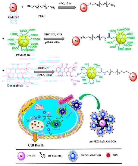 Au NPs with a large surface area can be deployed as effective platforms for therapeutic agents, allowing for the efficient binding of targeting agents and drugs. In one study, Au nanomaterials stabilized by pullulan were coupled with 5-fluorouracil and folic acid for targeted drug delivery and cancer imaging [28,51]. These nanosystems can be delivered to the cells via active or passive target delivery approaches. The passive targeting approach includes the deposition of the nanoparticles within the tumor’s irregular vasculature to permit the transfer of large particles through the endothelium. The passive targeting approach depends on the enhanced permeability and retention (EPR) effect; however, active targeting hinges on ligand–receptor binding precisely formed for targeting analytes to attain specificity and selectivity features. In one study, a drug delivery nanosystem was designed on the basis of multifunctional Au NPs for the intracellular delivery of a doxorubicin anticancer drug (Figure 2) [15]. The NPs were further stabilized with thiolated polyethylene glycol, and then covalently coupled with a polyamidoamine G4 dendrimer. Notably, it was indicated that polyethylene glycol polymer–coated Au NPs exhibited better colloidal stability and biocompatibility with negligible toxicity compared to citrate-coated Au NPs. Consequently, doxorubicin was efficiently and specifically delivered to the targeted cells, providing pH-triggered multifunctional nanoplatforms for the intracellular transferring of different anticancer agents [15].