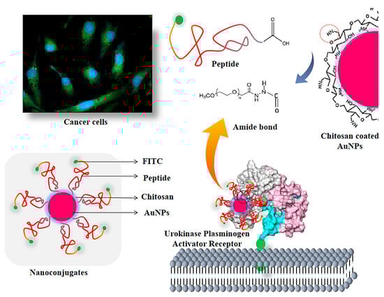 Currently, numerous in vitro and in vivo studies have been performed on cancer diagnosis and therapy applications of Au NPs due to their unique physicochemical properties and high versatility [54,55]. Functionalized Au NPs with high biocompatibility exhibited attractive potential in photothermal therapy and the thermal destruction of cancers [56]. For instance, Au NRs functionalized with folic acid were deployed for targeted delivery to melanoma cells [57]. The prepared nanosystem exhibited alluring possibilities for photothermal cancer therapy. As a result, apoptosis (~10.2%), necroptosis (~18.3%), and necrosis (~17.6%) of tumor cells could be obtained at lower temperatures, but after increasing the temperature to 49 °C, the pattern of cell death changed to necrosis-dominant (~52.8%) [57]. Moreover, fungal-crude-protein-extract–mediated Au nanomaterials (~19.72 nm) were functionalized with an aptamer to improve their cytotoxic effects on cancerous cells while reducing their toxicity in normal NIH3T3 cells. Consequently, the nanosystem exhibited improved accumulation in cancerous cells, thus providing nucleolin-targeted cell cytotoxicity via nucleus damage and stimulation of oxidative stress [58]. For the detection of cancer cells, a nanosystem was designed on the basis of fluorescently labeled peptide-functionalized Au nanomaterials and chitosan polymer for the specific targeting and imaging of urokinase plasminogen activator receptor positive cells (Figure 3). This nanosystem with improved uptake potential should be further explored for specific molecular targeting and imaging in cancers and tumors (especially in metastasis) [59].