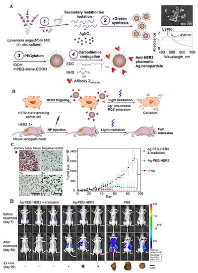 (A) The preparative process of Ag-PEG-HER2 NPs. (B) Photothermal-induced death of cancer cells via targeted delivery of functionalized Ag NPs to specific cells under the light irradiation, causing Ag+ ions release and ROS generation with total tumor elimination. (C-a) Immunohistochemistry of primary tumor tissue and Hercep Test controls: negative HER2 expression (1+) and HER2 overexpression (3+). (C-b) Dynamics of tumor growth under the treatment with injections of phosphate-buffered saline (PBS), Ag-PEG-HER2 NPs, and Ag-PEG-HER2 with 1 h post blue light irradiation. (D) Bioluminescent imaging of BT/NanoLuc xenograft tumors before treatment on day 7 and after treatment on day 80, as well as ex vivo imaging of primary tumors (day 90). Adapted from Ref [71] with permission (CC BY) Copyright 2022 Multidisciplinary Digital Publishing Institute (MDPI).
