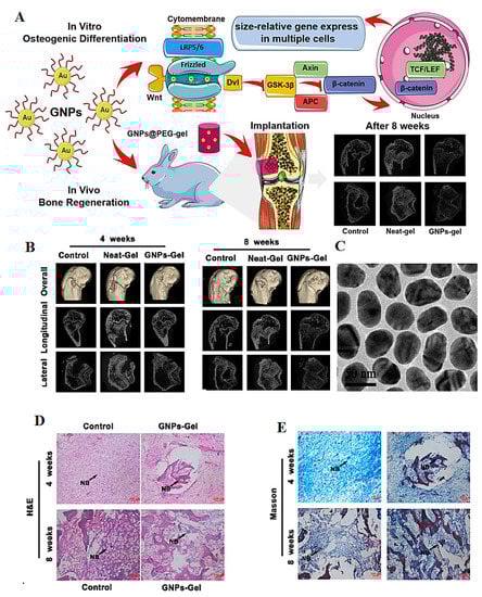 Au NPs have been established as promising nanomaterials for bone regeneration. These NPs can improve the osteogenic differentiation of mesenchymal stem cells, act as osteogenic agents, increase the grafting of bone implants, and hasten bone formation in bone defects [78,79]. Results have illustrated that hydrogels loaded with Au NPs can increase the differentiation, proliferation, and alkaline phosphate activities of human adipose–derived stem cells to be differentiated into osteoblast cells [80]. Chitosan-conjugated Au NPs affected bone differentiation. Positively charged NPs with a hydrodynamic diameter of 40 nm were formed through the chitosan reduction assay. The results revealed that Au NPs conjugated with chitosan can enhance the expression of marker genes related to bone differentiation in mesenchymal stem cells derived from human fat at low concentrations. They illustrated that such nanostructures can improve osteogenesis through the Wnt/β-catenin signaling pathway and can be deployed in bone tissue engineering [81]. PEGylated Au NPs with a size of 45 nm showed good biocompatibility and osteogenic differentiation on MC3T3-E1 cells. PEGylated Au NPs can increase alkaline phosphatase (ALP) activity, the expression of osteogenic marker genes, and up-regulated β-catenin and p-GSK-3β genes (Figure 5). In addition, Au NPs @PEG-gel encouraged bone regeneration effectively in vivo. This evaluation of the effects of functionalized Au NPs on osteogenic differentiation and bone regeneration could shed light on their clinical translational applications [82].