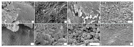 Scanning electron microscopy (SEM) of Lip, Lip-DOX, Lip-CB, Lip-DOX/CB, PEG-Lip, PEG-Lip-DOX, PEG-Lip-CB, and PEG-Lip-DOX/CB.
