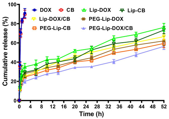 The efficacy of PEG-Lip-DOX, PEG-Lip-CB, and PEG-Lip-DOX/CB, compared to Lip-DOX, Lip-CB, and Lip-DOX/CB, in controlling the release of the loaded drugs was evaluated at pH 7.4 using a dialysis bag method and standard curves (Figure S2). The results demonstrated that the loaded drug was released from the formulations in a biphasic manner, in which the release was initiated with a burst phase and continued with a slower sustained release. In the burst phase, 24, 22.5, 18.5, 19, 17, and 15% of the loaded drugs were released from Lip-DOX, Lip-CB, Lip-DOX/CB, PEG-Lip-DOX, PEG-Lip-CB, and PEG-Lip-DOX/CB, respectively, in the first 30 min of the study. These burst releases could have resulted from the release of the adsorbed drug [19]. These burst releases continued with a slow and sustained release, in which 76, 73.3, 66.5, 62.1, 59.6, and 56.3% of the loaded drugs were released from Lip-DOX, Lip-CB, Lip-DOX/CB, PEG-Lip-DOX, PEG-Lip-CB, and PEG-Lip-DOX/CB, respectively, after 52 h (Figure 2). According to these results, the PEGylated formulations (PEG-Lip-DOX, PEG-Lip-CB, PEG-Lip-DOX/CB), compared to the non-PEGylated formulations (Lip-DOX, Lip-CB, and Lip-DOX/CB), were more efficient by ~18.3, 18.7, and 15.4%, respectively, in preserving the loaded drugs and releasing them for a longer time. PEG, through coating the surface of nanoparticles, restrains the drug leakage from the particles. Premature drug release is a problem for the application of nanoparticles that could be resolved through PEGylation. In addition, the results demonstrated that 89–93 and 100% of the standard DOX and CB were released from their relevant solutions after 2 and 2.5 h, respectively (Figure 2), indicating the high efficacy of PEG-Lip-DOX, PEG-Lip-CB, PEG-Lip-DOX/CB, Lip-DOX, Lip-CB, and Lip-DOX/CB to control the drug release. Papp et al. [42] also demonstrated that reversed-phase-synthesized PEGylated liposomes, compared to reversed-phase-synthesized non-PEGylated liposomes, caused a lower amount of drug release after 48 h (~20 vs. ~50%).