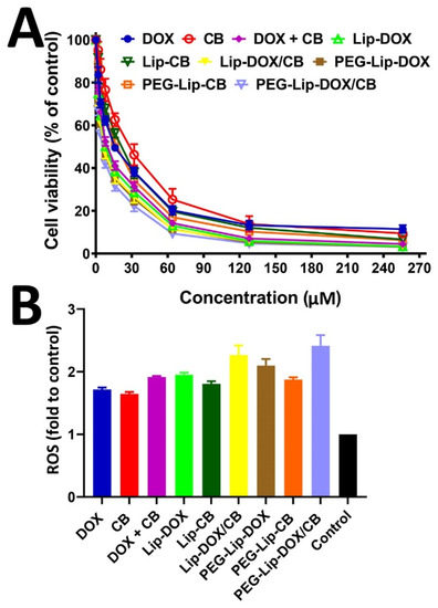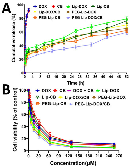 (A) Cumulative drug release from Lip-DOX, Lip-CB, Lip-DOX/CB, PEG-Lip-DOX, PEG-Lip-CB, and PEG-Lip-DOX/CB and (B) cell viability effects of Lip-DOX, Lip-CB, Lip-DOX/CB, PEG-Lip-DOX, PEG-Lip-CB, and PEG-Lip-DOX/CB three months after preparation. The data are expressed as mean ± SD (n = 3).