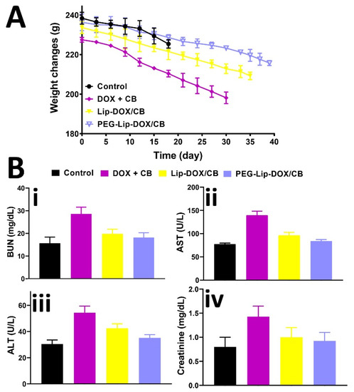 (A) Weight changes in brain-tumor-bearing rats in DOX + CB, Lip-DOX/CB, and PEG-Lip-DOX/CB receiver groups at three-day intervals and for 39 days after tumor cell inoculation and (B) serum concentrations of (i) alanine aminotransferase (ALT), (ii) aspartate aminotransferase (AST), (iii) BUN, and (iv) creatinine in DOX + CB, Lip-DOX/CB, and PEG-Lip-DOX/CB receiver glioblastoma-bearing rats compared to the control group.