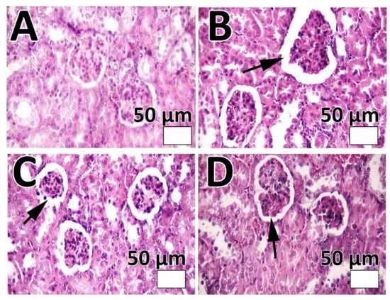 Results of renal histopathological studies in (A) control; (B) DOX + CB; (C) Lip-DOX/CB; and (D) PEG-Lip-DOX/CB receiver groups of glioblastoma-bearing rats. As the results show, acute tubular necrosis was more evident in DOX + CB group, compared to Lip-DOX/CB and PEG-Lip-DOX/CB groups. Arrows show acute tubular necrosis (Magnification ×40).