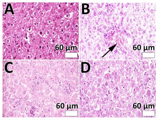 Results of liver histopathological studies in (A) control; (B) DOX + CB; (C) Lip-DOX/CB; and (D) PEG-Lip-DOX/CB receiver groups. As the results show, no cellular damage was observed in control, Lip-DOX/CB, and PEG-Lip-DOX/CB receiver groups; however, liver cell necrosis (arrow) was observed in DOX + CB group. (Magnification ×40).