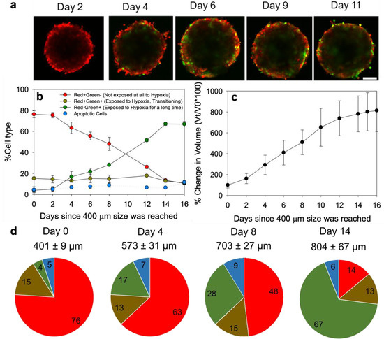 Confocal images of the spheroids formed by the MDA-MB-231HR cells demonstrated heterogeneous spatial distributions of the cells that have experienced hypoxic conditions (green) and the cells that have only experienced normoxic conditions (red) (Figure 2a). As the size of the MDA-MB-231HR spheroids grew from 400 μm to 800 μm in diameter, the cell population distributions evolved. The population of the cells that have experienced hypoxic conditions (Figure 2b, green symbols) grew monotonically after day 4 (spheroid diameter > 573 ± 31 µm, Figure 2c) whereas the population of the cells that never experienced hypoxic conditions decreased (Figure 2, red symbols). The population distribution was unchanged post day 14 (spheroid diameter > 804 ± 67 µm) with >65% of the cells having had experienced hypoxic conditions within the spheroids (green symbols). The flow cytometry results for the selected days are shown in Figure 2d. The observed changes in the population distributions (increasing fraction of hypoxic cells) could be attributed to the increasing formation of the hypoxic regions within the spheroids of increasing size; the relatively slow O2 transport within the spheroids’ interstitium is expected to have contributed to the generation of the heterogeneous O2 spatiotemporal microdistributions which would become more pronounced as the spheroid size increased over time. One of the reasons of the development of hypoxic and/or of acidic microenvironments within the spheroids (the acidity was demonstrated before, Figure S12 in [23]), is due to the limited diffusivities of oxygen and protons in the spheroid interstitium, relative to the rates of their consumption or production, respectively, by the cells comprising the spheroids.