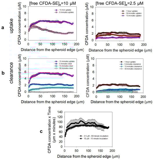 Different rates of exposure at the same ‘cumulative dose’ of a surrogate of the free drug in the spheroids. Microdistributions in the spheroids of the fluorophore CFDA-SE that was incubated with the spheroids in free form at 10 µM (left column, for up to 15 min) and 2.5 µM (right column, for up to 1 h), and was used as the drug surrogate. (a) “Uptake” microdistributions over time, when the spheroids were incubated with the free CFDA-SE in the surrounding media. (b) “Clearance” microdistributions over time, when the spheroids were transferred in media without CFDA-SE. (c) The time-integrated concentrations of the drug surrogate (AUC) along the spheroid radius for the corresponding incubation conditions indicate similar profiles (cumulative radial doses) within the spheroids. Values reported as mean ± standard deviation of n = 3–4 spheroids imaged per time point.