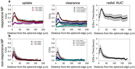Microdistributions in the spheroids of the fluorophore CFDA-SE delivered by (a) responsive NP, and (b) non-responsive NP. The first column shows the spatiotemporal microdistributions during the “uptake” (in the presence of the NP), and the second column during the “clearance” (after the removal of the NP from the incubation medium) of the delivered CFDA-SE in the spheroids. The plots on the righthand column show the time-integrated concentrations of the drug surrogate (AUC) along the spheroid radius for the corresponding delivery approaches. Values reported as mean ± standard deviation of n = 3–4 spheroids per time point.