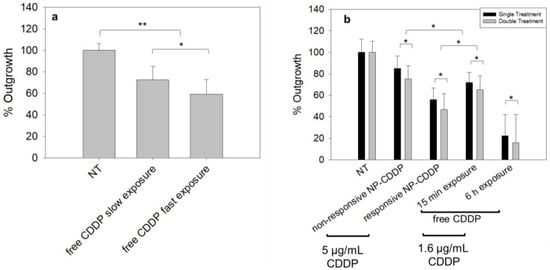 Following a single treatment with CDDP (Figure 5b, black bars), the greatest suppression of the cell outgrowth was observed when CDDP was delivered by the responsive NP-CDDP, followed by the treatment with the free agent (for a 15 min incubation), in agreement with previous reports [24]. This order in efficacy was attributed to the corresponding microdistributions of CDDP in the spheroid, and followed the trend of the AUC plots shown in Figure 3 and Figure 4. In the double treatment regimens (Figure 5b, gray bars), the trend in efficacy was unchanged. Importantly, the therapeutic effect was similar to the effect for the single treatment, although the cumulative concentration of CDDP that was incubated with the spheroids was significantly less than the CDDP concentration used in the single treatment approach.