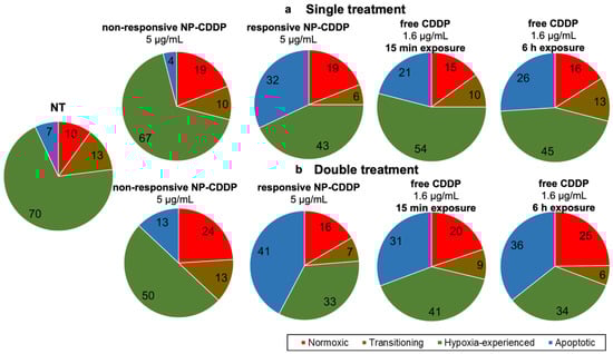 Effect of the type of the CDDP treatment(s) on the progression of the cell populations in the spheroids, evaluated using flow cytometry. Percentage of the cell population of the cells for single (a) and double (b) treatment with CDDP in different forms. Cells that have not experienced hypoxia (red), cells that were transitioning or partially exposed to hypoxic conditions (brown), cells that have experienced hypoxic conditions (green), and cells that have undergone apoptosis (blue). CDDP concentration was 5 µg/mL in the single treatments, and 2.5 µg/mL in the double treatments (followed by the same dose of free CDDP, as summarized on Table S3). Charts represent the averaged values of n = 3 spheroids per treatment for n = 3 independent treatment preparations/ measurements.
