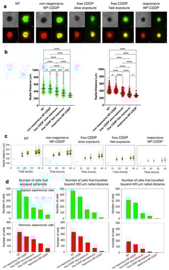 Figure 7 shows that the rate of exposure to CDDP of the cells in the MDA-MB-231HR spheroids affected not only the overall cell survival (as shown in Figure 5) and the progression of the cell populations (as shown in Figure 6), but also the extents of the distances travelled by the cells (cell migration). For treatments with free CDDP, the faster rate of exposure (free CDDP/ fast exposure) resulted in a greater cell kill (Figure 5a) and in shorter distances (Figure 7b) travelled outside the spheroids by fewer cells (Figure 7c,d), compared to the slow rate of the exposure to free CDDP with the same AUC within the spheroids (Figure 3c). Similarly, when delivered by the pH-responsive NP (responsive NP-CDDP), the treatment resulted in the best inhibition of migration, both in terms of the distance travelled by the cells and in terms of the number of cells that travelled the longer distances. As expected [21,36], the cells that have experienced hypoxia (green) travelled longer distances than cells in the normoxic conditions (red) (Figure S6). Interestingly, the faster rate of exposure to CDDP decreased cell migration, independent of the cells being in hypoxic or normoxic environments (Figure 7b,d).