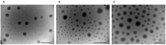 Typical TEM photomicrograph of lidosomes: (A) LD 5.5B; (B) LD 7.9, and (C) LD formulations. Bar is 1 μm.