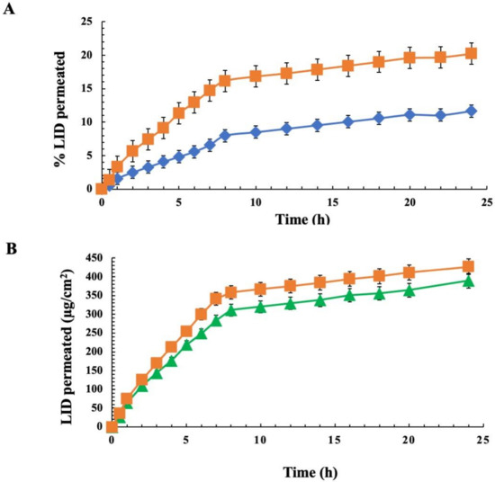 Comparison of LID permeation profiles through rabbit ear skin at 37 °C from several gel formulations: (A) (♦) Gel LID vs. (■) LD gel CMC; (B) (▲) LD gel F-127 vs. (■) LD gel CMC. Results are expressed as mean mean ± SD (n = 3).