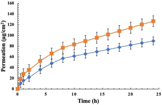 Permeation profile of (♦) LID and (■) CA simultaneously released from LD:CA formulation through rabbit ear skin at 37 °C over 24 h. Results are expressed as mean mean ± SD (n = 3).