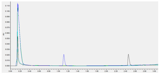 UHPLC chromatogram overlays showing the elution profiles of cysteamine at 215 nm (dark blue) and its oxidation product cystamine at 244 nm (black) in the studied matrix, Aquoral® (green at 215 nm, light blue at 244 nm). Data were collected and processed with Empower® 3 Software Application Manager.