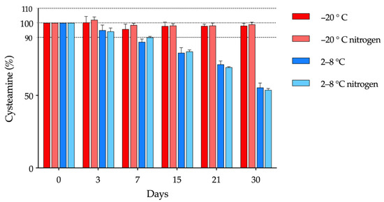 For this study, a new determination method was developed based on the one previously proposed by Kim et al. [38], which allows for the detection of both cysteamine and cystamine, in a short analysis period of just 6 min. Our results showed that the cysteamine compounded formulation was not stable beyond 7 days when stored at 2–8 °C in single dose vials, which is impractical for patients and HPDs daily work, but when preserved at −20 °C, a stability of at least 30 days was achieved. These findings are consistent with those previously published in the literature reporting that oxidation to cystamine is favored at high temperatures [21,47,49,50,51]. Reda et al. previously showed the effects of storage in the refrigerator and freezer for up to 52 weeks, where it was seen that conservation at −20 °C guaranteed a longer period of validity [21]. Although the results differ slightly from those of the present work, it is important to consider the differences in terms of the composition of the mixture, final packaging, and determination method.
