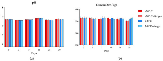 Osmolality values (around 350 mOsm/Kg) of the formulations under the four experimental conditions remained between ±5% of the initial values over the study period (Figure 3b), being the dispersion of the values greater at day 30.