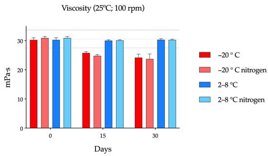 The initial viscosity of the formulations, measured at 25 °C and 100 rpm, was found to be around 30 mPa·s, as seen in Figure 4. On day 15 of the study, single-dose vials stored in the freezer showed a statistically significant drop in viscosity (p = 0.0098) with respect to that measured at day 0. On day 30, no statistically significant changes were observed with respect to the previous measurement on day 15, although the differences with respect to day 0 were maintained (p = 0.0057). On the other hand, for samples preserved in the refrigerator, viscosity hardly varied between days 0, 15, and 30. It was also observed that saturation with nitrogen did not introduce variations in the viscosity of the formulation when comparing vials kept at the same temperature.