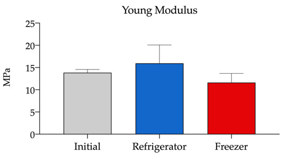 where E is the Young’s modulus, σ is the force per unit area, and ε is the proportional deformation. Young’s modulus values were obtained in this study by Trapezium X software directly from the slope of the tensile stress-deformation curve in the initial linear elastic region of the trace, considering the dimension of the probe used in the experiment. The results showed no statistically significant differences between the two storage temperatures of the containers over time (Figure 5). In addition, the change in volume of the content with freezing did not cause modifications in its elastic properties.