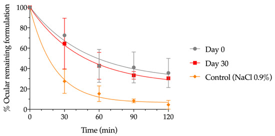 Data were fitted to a mono exponential equation dependent on time, as shown in Figure 6, and the pharmacokinetic parameters obtained by fitting to the one-compartmental model. A half-life of 33.86 min for day 0 after formulation and 31.11 min for day 30 after formulation, when stored at −20 °C, was obtained, demonstrating no influence of freezing on this parameter and showing an ocular residence time more than two-fold higher than for NaCl 0.9%, whose half-life was 14.63 min.