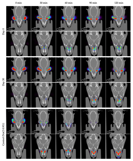 Figure 7 shows an axial view of the PET registration images of animal heads immediately after administration and 30, 60, 90, and 120 min after instillation, showing the distribution of the labelled formulation. Initially, the formulation is located on the surface of the eye. After 2 h, the concentration in the eye was still significant, indicating a long retention time on the ocular surface. An additional radiotracer signal was detected in the nasolacrimal duct and nasal cavity, as part of the formulation entered the nasal cavity from the lacrimal sac.