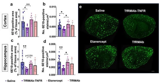 Chronic TfRMAb-TNFR treatment significantly reduced cortical 6E10-positive Aβ area (p < 0.05; Figure 1a,e) and 6E10-positive puncta number (p < 0.05; Figure 1b,e) compared to the saline-treated mice. TfRMAb-TNFR treatment also significantly reduced hippocampal 6E10-positive Aβ area (p < 0.01; Figure 1c,e) and 6E10-positive puncta number (p < 0.01; Figure 1d,e) compared to the saline-treated mice. Etanercept or TfRMAb treatment did not reduce the 6E10-positive Aβ load in the aged APP/PS1 mice compared to the saline-treated mice. Etanercept-treated mice had significantly higher cortical 6E10-positive Aβ area (p < 0.01; Figure 1a,e) and 6E10-positive puncta number (p < 0.05; Figure 1b,e) compared to the TfRMAb-TNFR-treated mice. The hippocampal 6E10-positive puncta number (p < 0.05; Figure 1d,e) was significantly higher in the etanercept-treated mice compared to the TfRMAb-TNFR-treated mice and a similar trend was observed for the hippocampal 6E10-positive area (p = 0.054; Figure 1c,e).