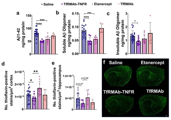 With respect to the cerebrum Aβ ELISAs, both TfRMAb-TNFR and etanercept reduced insoluble (Gu-HCl-soluble) Aβ (1-42) (p < 0.001; Figure 2a) and soluble (TBS-soluble) high-molecular-weight Aβ oligomers (p < 0.001; Figure 2b) compared with the saline-treated mice. However, only TfRMAb-TNFR significantly reduced the insoluble (Gu-HCl-soluble) high-molecular-weight Aβ species (p < 0.05; Figure 2c) and the cortical Thio-S-positive mature Aβ plaque numbers (p < 0.05; Figure 2d,f). A similar trend of reduced hippocampal Thio-S-positive mature Aβ plaque numbers (p = 0.07; Figure 2e,f) was observed for the TfRMAb-TNFR-treated mice. Like the 6E10-positive Aβ load, etanercept-treated mice had a significantly higher cortical Thio-S-positive mature Aβ plaque number compared with the TfRMAb-TNFR-treated mice (p < 0.01; Figure 2d,f) and a similar trend was observed in the hippocampus (p = 0.06; Figure 2e,f). TfRMAb alone did not affect Aβ (1-42) or oligomeric Aβ.