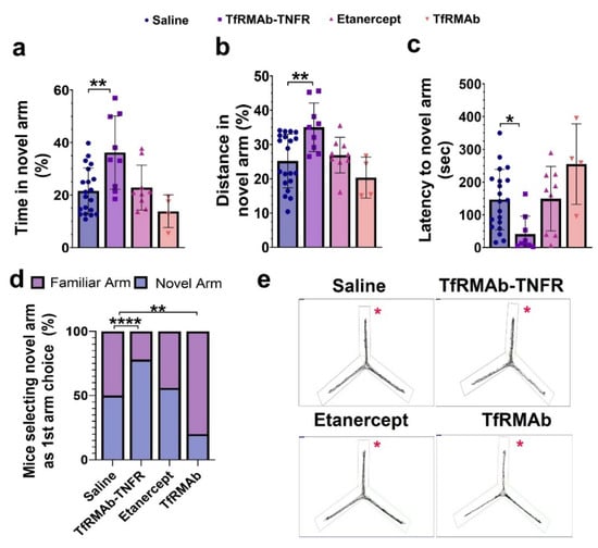 Effect of chronic TfRMAb-TNFR dosing on spatial reference memory using the Y-maze test. TfRMAb-TNFR treatment increased the time spent (a) and distance traveled (b) in the novel arm and reduced the latency to the novel arm (c) compared to the saline-treated mice. More TfRMAb-TNFR-treated mice selected the novel arm as their first choice compared to the saline-treated mice (d). Representative trajectory maps of mice in the Y-maze (e). The novel arm is shown by the red asterisk. Data are presented as mean ± SD of n = 4–20 per treatment group, numerical data were analyzed using the one-way ANOVA with the Holm Sidak’s post hoc test, and nominal data were analyzed using the Fisher’s exact test. * p < 0.05, ** p < 0.01, **** p < 0.0001 for the indicated comparisons.