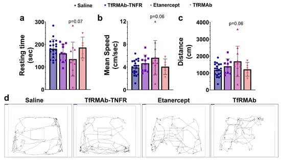 TfRMAb-TNFR-treated mice spent more time (p < 0.01; Figure 3a,e) and traveled more distance (p < 0.01; Figure 3b,e) in the novel arm compared to the saline-treated mice. TfRMAb-TNFR-treated mice had a reduced latency to enter the novel arm (p < 0.05, Figure 3c), and the percentage of mice selecting the novel arm as their first arm choice was significantly higher for the TfRMAb-TNFR-treated mice compared to the saline-treated mice (p < 0.0001, Figure 3d). The percentage of mice selecting the novel arm was significantly lower for the TfRMAb-treated mice than for the saline-treated mice (p < 0.01, Figure 3d). However, due to the small sample size of the TfRMAb group, these results should be interpreted with caution. To rule out the impact of locomotion on the Y-maze outcome, we performed the open-field test to assess the exploration and locomotion of the APP/PS1 mice. As shown in Figure 4a–d, all three locomotion parameters: resting time (Figure 4a), mean speed (Figure 4b), and distance traveled (Figure 4c), did not differ significantly between any experimental group.