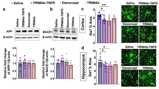 The protein levels of APP and BACE-1 were determined in the cerebrum homogenates and are shown in Figure 5a,b. No differences in APP (Figure 5a) and BACE-1 (Figure 5b) protein levels were found between the experimental groups. Chronic TfRMAb-TNFR or etanercept treatment reduced the Iba1-positive area (microgliosis) in the cortex (p < 0.05 for TfRMAb-TNFR and p < 0.01 for etanercept; Figure 5c) and the hippocampus (p < 0.05 for TfRMAb-TNFR and etanercept; Figure 5d). Chronic TfRMAb dosing did not alter microgliosis in the aged APP/PS1 mice.