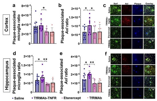 To study the association between mature Aβ plaques and microglia, we measured the plaque-associated microglia ratio, which measures the area occupied by the microglia associated with the plaque normalized to the Aβ plaque area. As shown in Figure 6, the plaque-associated microglia ratio was significantly higher in the cortex (p < 0.05; Figure 6a,c) and hippocampus (p < 0.01; Figure 6d,f) of the TfRMAb-TNFR-treated mice compared to the etanercept-treated mice. The hippocampal plaque-associated microglia were also significantly higher in the TfRMAb-TNFR-treated mice compared to the saline-treated mice (p < 0.05; Figure 6d). Interestingly, the plaque-associated Axl ratio, which represents the immunoreactivity of Axl, a phagocytic marker [], in the plaque-associated microglia, was significantly higher in the cortex (p < 0.05 compared to saline and etanercept; Figure 6b,c) and the hippocampus (p < 0.05 compared to saline and p < 0.01 compared to etanercept; Figure 6e,f) of the TfRMAb-TNFR-treated mice compared to the saline- and etanercept-treated mice. The measured autofluorescent Aβ plaque area was not negatively correlated with the plaque-associated microglia ratio or the plaque-associated Axl ratio suggesting that the higher plaque-associated microglia or Axl ratio in the TfRMAb-TNFR-treated mice and the lower plaque-associated microglia or Axl ratio in the etanercept-treated mice are not driven by the lower and higher autofluorescent Aβ plaque area in the TfRMAb-TNFR and etanercept groups, respectively (Supplementary Materials Figure S1).