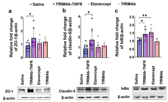 3.4. TfRMAb-TNFR Treatment Increased BBB Tight-Junction Proteins and Reduced Neuroinflammation