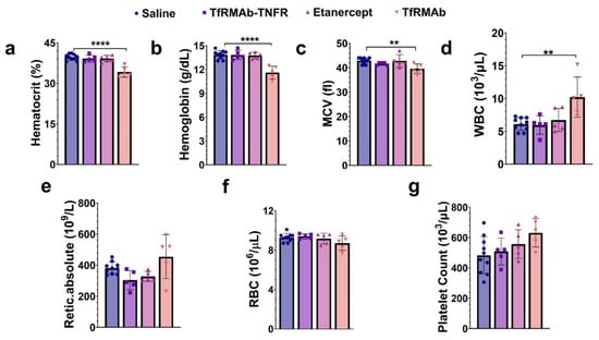TfRMAb dosing of 10.7-month-old APP/PS1 mice for ten weeks reduced hematocrit (p < 0.0001; Figure 8a), hemoglobin (p < 0.0001; Figure 8b), and mean corpuscular volume (MCV, p < 0.01; Figure 8c), and increased white blood cell count (WBC, p < 0.01; Figure 8d) compared to the saline-treated mice. No change in reticulocytes (Figure 8e), red blood cells (RBC) (Figure 8f), and platelets (Figure 8g) was observed between any treatment group compared to the saline-treated mice. TfRMAb-TNFR or etanercept treatment did not alter any hematology indices following a ten-week treatment compared to the saline-treated mice.